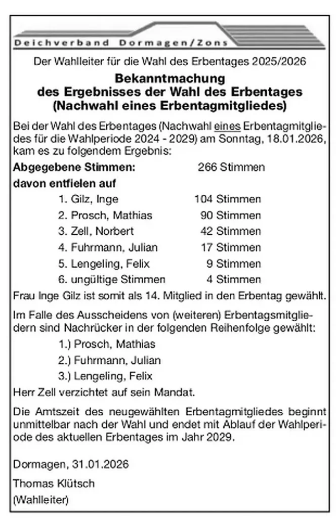 Bekanntmachung (Nachwahl eines Erbentagmitgliedes)